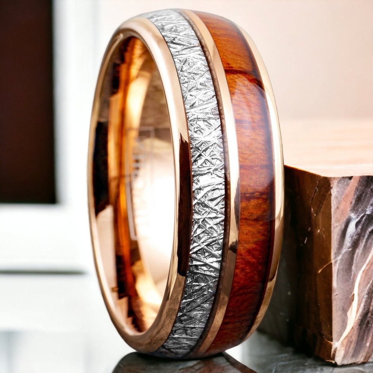 About this Rose Gold Koa Wood and Meteorite Wedding Ring
