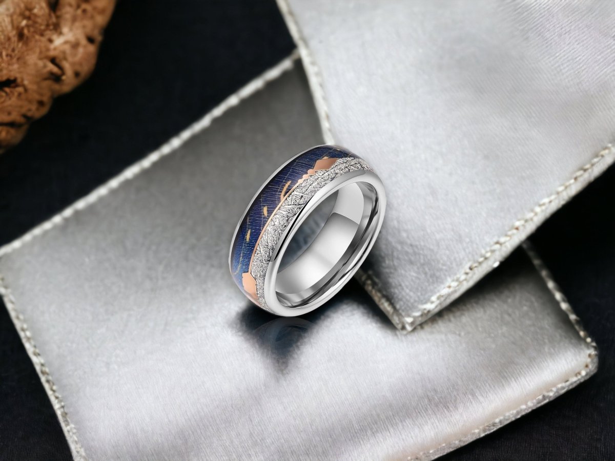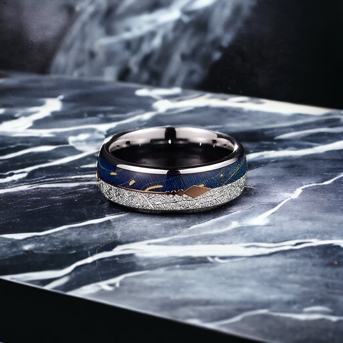 Step into celestial elegance with our exquisite meteorite and blue wood ring, adorned with a captivating Faux Meteorite Inlay and a striking Blue Wood Inlay. This unique combination of cosmic allure and natural beauty creates a mesmerizing accessory that's perfect for those who appreciate distinctive style. Elevate your look with our exceptional Silver Tungsten Ring, harmonizing Faux Meteorite and Blue Wood Inlays in one stunning piece. The ring is finished with an elegant rose gold arrow circling the ring.