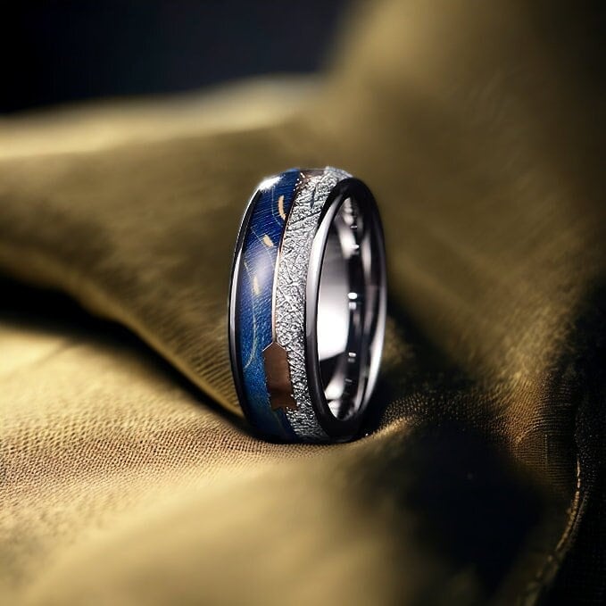 Material(s): Tungsten Carbide, Faux Meteorite, Blue Stabilized Wood